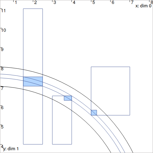 IntervalVector x(2, Interval(-1,3)); // creates [x]=[-1,3]×[-1,3]=[-1,3]^2 IntervalVector y{{3,4},{4,6}}; // creates [y]= [3,4]×[4,6] IntervalVector z(3, Interval(0,oo)); // creates [z]=[0,∞]^3 IntervalVector w(y); // creates a copy: [w]=[y] Vector v(3, 0.42); // one vector (0.42;0.42;0.42) IntervalVector iv(v); // creates one box that wraps v: // [0.42,0.42]×[0.42,0.42]×[0.42,0.42]